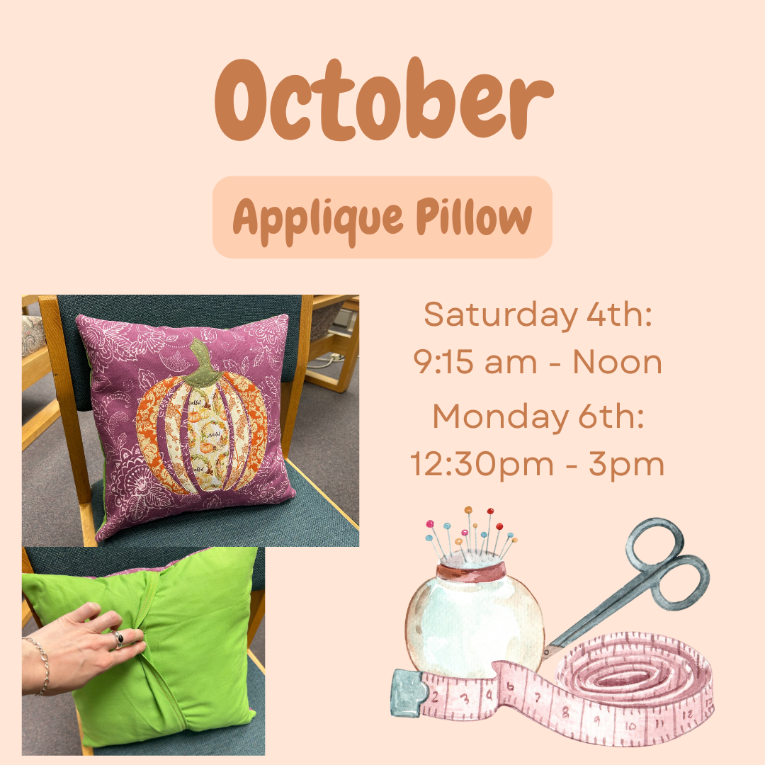 October’s project is an Applique Pillow. The Saturday, October 4th class from 9:15 to noon is waitlist only as of 8/15. You can get on the waitlist and if someone can’t make it you might get a spot!